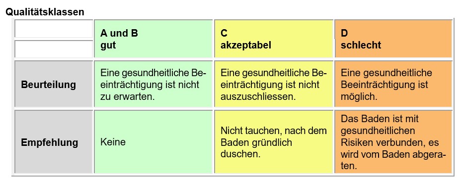 Auf Grund der Untersuchungsergebnisse wird das Badewasser in die Qualitätsklassen A - D eingeteilt (siehe auch "Dokumentation: Übersichtsgrafik Qualitätsklassen"):